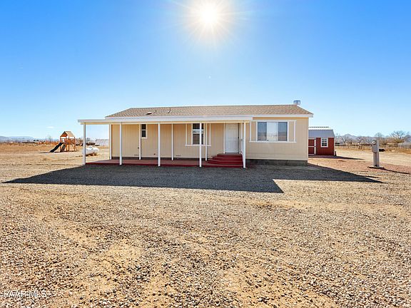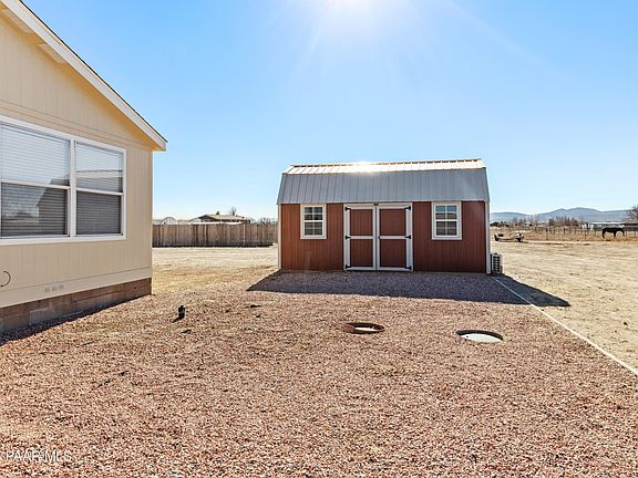 REDUCED! Your Home on the Range in Paulden! This is a 2003 Champion Home Builders 2BD 2BA 1034sqft single level Manufactured home on a level 5.27AC lot with wonderful Views featuring Kitchen Island, LG Propane Gas Range, LG Dishwasher, Open Concept Dining Room open to the Living Room, Vinyl Laminate Flooring in most rooms/Carpet in 2BD. Perimeter Fenced Lot with 2 Gates! Horses allowed & Pets welcome! Covered Front Deck with Open Back Deck off the separate Laundry Room. Home includes 3 Sheds! The possibilities are endless in this quiet & serene location! PRIVATE WELL! Home is NOT in the floodplain! Newer interior/exterior paint in 2024. Home equipped with FHA Tiedowns on Stemwall--Engineering Certification in Attached Docs. Yavapai Bottle Gas Propane to be read/prorated at COE.