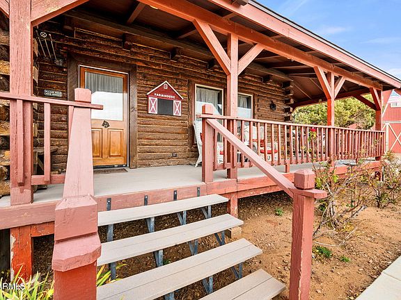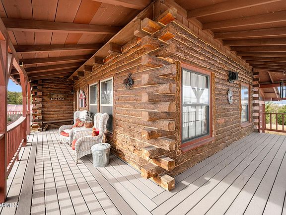 Rustic elegance and breathtaking views in this one-of-a-kind retreat. Perfect for multi-generational living or a peaceful getaway. This sprawling property offers a 1,826 sq. ft. log home and two charming guest houses totaling 608 sq. ft. Thoughtfully designed with beamed ceilings, tongue-and-groove wood finishes, and luxury vinyl flooring; custom antique lighting, and cozy gas flame stove, this home captures the essence of cozy comfort. The kitchen includes a farmhouse kitchen sink with knotty hickory cabinets, butcher block counters, a vintage gas stove, and modern white appliances. Custom touches in the bathrooms include antique vanities and a clawfoot tub. Enjoy 5.98 splitable private acres with a Trex wraparound porch, 4-car garage/barn, horse facilities, a chicken coop. This home also has a new roof. Please see the attached documents for more information.
