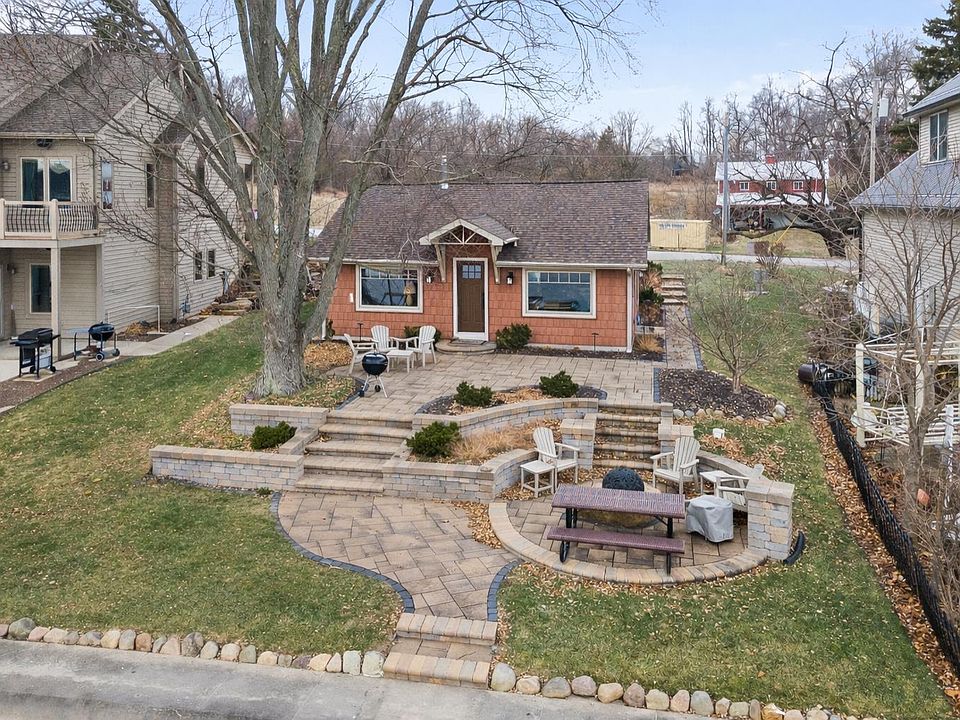 Perfectly positioned on the north side of Crooked Lake in the highly desirable First Basin, this exceptional lakefront retreat offers 45 feet of frontage on one of Northeast Indiana’s most sought-after all-sports lakes, ideal for boating, fishing, kayaking, and endless summer fun. Originally built in 1953, this home truly defines the term lake cottage, offering 728 square feet of cozy living space with two bedrooms and one full bath. The open kitchen and family room are anchored by a gas fireplace and a wall of windows, perfectly framing peaceful lake views. Thoughtfully maintained and passed through just two families, the property reflects pride of ownership throughout. Between 2017–2018, the cottage was comprehensively remodeled and transformed into a true year-round residence by Lakeshore Design, seamlessly blending its classic lake character with modern comfort and reliability. Improvements include new siding, insulation, windows, doors, roof, HVAC system, on-demand hot water heater, gas fireplace, Generac gas backup generator, updated electrical, and a new parking lot. Extensive paver stone walkways, terraced patios, landscape lighting and a lakeside fire pit, all custom designed around a mature maple tree providing shade and creating the ideal outdoor setting for entertaining and relaxation. A private well (2005) serves the home, while public sewer is provided by the Steuben Lakes Regional Waste District. Plumbing was updated in 2010, and the interior showcases original Ponderosa pine, preserving the warm, authentic cottage feel. Enjoy a sandy/silty beach with a gradual slope to 5-foot at the end of the 70-foot pier, providing ample space for swimming, docking, and lakeside lounging. Recent professional landscaping by Dubach Landscaping features Japanese maples, dwarf Hinoki trees, liriope, and a variety of decorative grasses, enhancing both beauty and privacy. Numerous lakeside restaurants are nearby, easy access to I69, and the city of Angola—with grocery stores, retail, dining, YMCA, and fitness options—is just a 5–10 minute drive. This is a rare opportunity to own a meticulously updated lakefront home with history, charm, and modern convenience in one of Crooked Lake’s most coveted locations.
