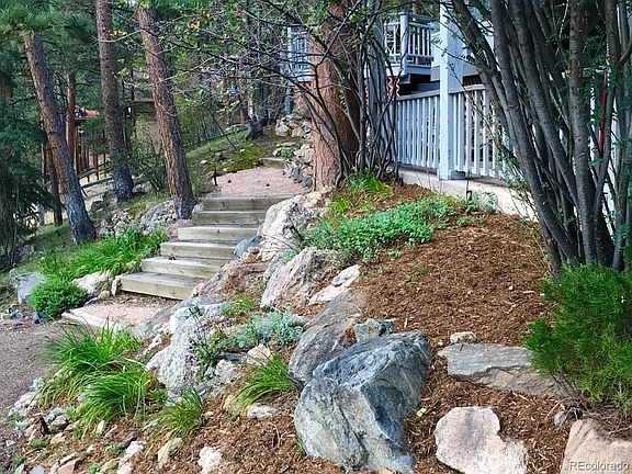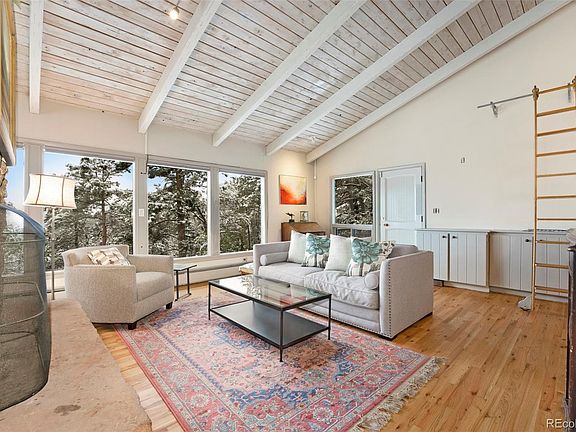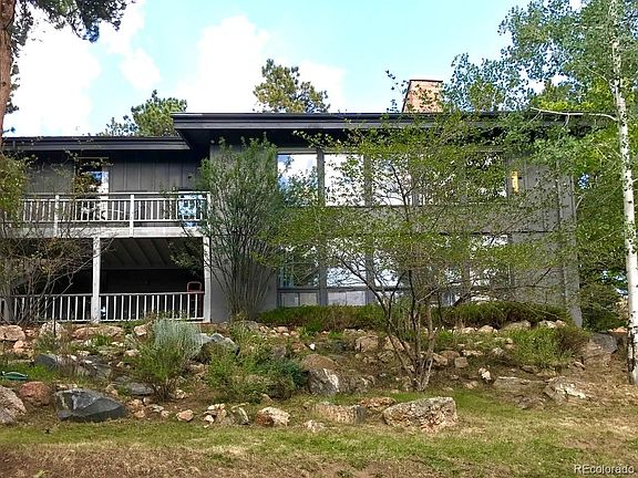 LOCATION, PRIVACY AND VIEWS! Hiwan Hills Mid-Century Modern home with exposed beams, vaulted tongue and groove ceilings, original wood flooring, and floor to ceiling moss-rock fireplace. Main floor master, and open floor plan with wall of windows for beautiful Mt. Evans views! Nestled on 1.4 gently sloping acres of grass, gardens and trees. Landscaped with paths, beds, rock gardens, mature maple and aspen--a gardener's dream. Paved access, 2-car garage, expansive decks, newer roof. Must see to appreciate the views, privacy and beauty of the parcel! Great bones and ready for updating to make this your forever home! Selling as-is.