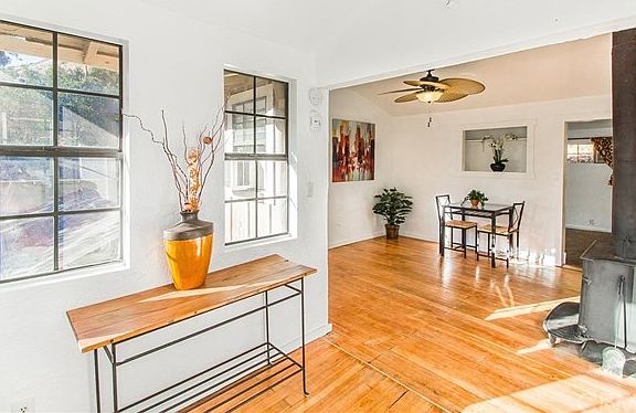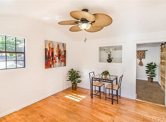 Quaint mountainside cabin nestled in Silverado Canyon. Formal entry to your living room featuring rustic wood flooring, cozy woodstove, ceiling fan and window A/C. Dining area in living room enjoys display shelving. Cook up some dinner with you new gas stove, tile counters, and cabinets with display shelving. Retire to the huge master bedroom with dual window A/C and walk-in closet. Soak in your tub in the master bathroom featuring tile flooring, pedestal sink and sliding barn door. The large second detached bedroom is above the garage and has a balcony deck with views of the canyon, great for relaxing with a cup of coffee. Entertain or BBQ in the patio area featuring a shady cabana. Amenities include a separate laundry room with washer/drying included. Ample windows with views of the canyon. Fresh interior and exterior paint. One car garage with a new roll-up door. Hike or bike in the Cleveland National Forest with miles of riding trails. Award-winning Chapman Hills Elementary, Santiago Middle School, and El Modena High. Local daycare available at the Silverado Children's center. Attractive low tax rate, no association dues, no Mello-Roos assessments. Short 10 minute drove to shopping and 35 minutes to the beach. Local community center with park, classes and events. Silverado public library and cafe.
