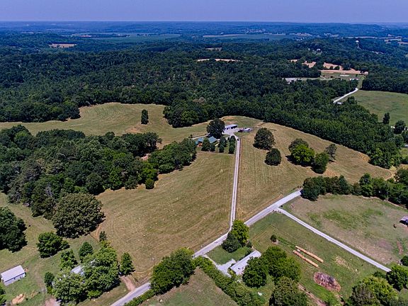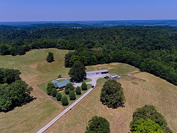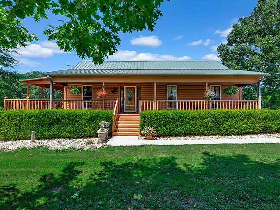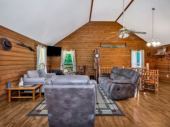34.7 Acres and 2412 sq. ft. cabin with Cedar Log siding, main floor offers ceiling fan, vaulted ceiling, solid wood knotty pine doors, slap cedar, pine plank walls, spacious kitchen with many built-ins, gas top cook stove, replica wood heater uses propane, LVP Flooring. One bedroom upstairs with in suite full bath with jetted tub, separate shower, twin vanities, Downstairs, pool table, gun safe remain. One bed, possibility of other bed room, one bath. Completely fenced 5 strand & net wire for cattle or horses, 2 ponds, Livestock Never Freeze watering system. 108x24 shop with 1/2 bath. Mostly Oak, Hickory and Poplar in wooded areas. Mostly Pasture. Hunter’s paradise for Deer and Turkey.