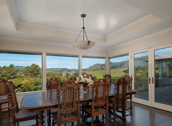 Panoramic mountain,valley,river & ocean views await the next owner of this well appointed Carmel Meadows home. Chef's kitchen with a Russell Range/BBQ, 2 fireplaces, sep dining room, dumb waiter serving bar with utility kitchen/laundry/wine cellar on lower level. Office work stations with built in shelving & north facing artist studio. Approx.3326 sq. ft on a 1/2 acre lot, 3+ br/4 baths.