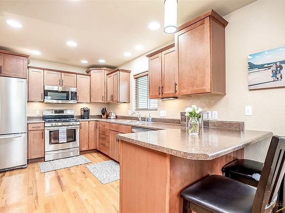 Beautiful ranch style home with walkout finished basement in popular Catron Crossing! What a great location for easy access to most parts of Rapid City. Completely-remodeled upstairs features modern color scheme, new light fixtures, luxury vinyl plank floors, new carpet (2020) in bedrooms, updated kitchen with new granite countertops and tile backsplash. 3 bedrooms on the main floor, 2 downstairs. Custom kitchen with stainless steel appliances, gorgeous cabinets with pull outs, buffet, large pantry, and breakfast bar! Main floor laundry and additional newly-finished downstairs laundry room. Awesome floorplan for entertaining. Huge dining area with vinyl plank floors. Gas fireplace. Master suite has plenty of room for furniture, huge walk-in tile shower and dual sinks. Walkout basement is completely finished featuring two additional bedrooms/office space, two storage rooms, a full bath, large laundry room and wet bar with beverage fridge and granite countertops both at the wet bar and in the bathroom! Enjoy a nice backyard with sprinkler system, curbed landscaping, and patio with gas fire-pit.