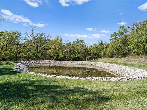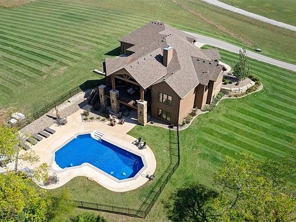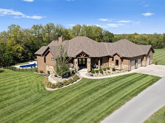 UNIQUE OPPORTUNITY! This custom-designed RANCH home, built in 2020, boasts over 4,505 +/- sq ft of exquisite finished living space. It features a 1485 sqft three+car side entry garage. The stunning interior showcases an open living area with a floor-to-ceiling stone wood-burning fireplace, abundant windows, and soaring ceilings that highlight the beautiful grounds. The chef's kitchen is a dream, equipped with two ovens, a six-burner designer gas stove, built in ice maker. Its large island, elegant stained cabinetry, and walk-in pantry create a seamless flow into the spacious dining area. Enjoy the built-in wine and coffee bar for added convenience. The first floor includes a lovely office with custom cabinetry and desk, a primary bedroom/bath suite and a 2nd bedroom suite with private bathroom. The finished walkout basement offers a large family room, 3rd and 4th bedrooms and the 4th can be a dance/exercise room. It also offers ample storage and a designated future pool room with a bathroom. Step outside to an inviting inground saltwater pool and spa, alongside a serene pond, all situated on nearly four acres of private land adorned with trees and open green spaces. It’s a quick six-minute drive to I-35 and 169 Highways, and close to Hillsdale Lake. Embrace the tranquility of your own small acreage with no gravel roads, featuring a paved road and a long concrete driveway. There’s plenty of space to build your dream outbuilding. The Gardner-Edgerton Schools district adds to the appeal, making this property perfect for families seeking a blend of luxury and practicality.