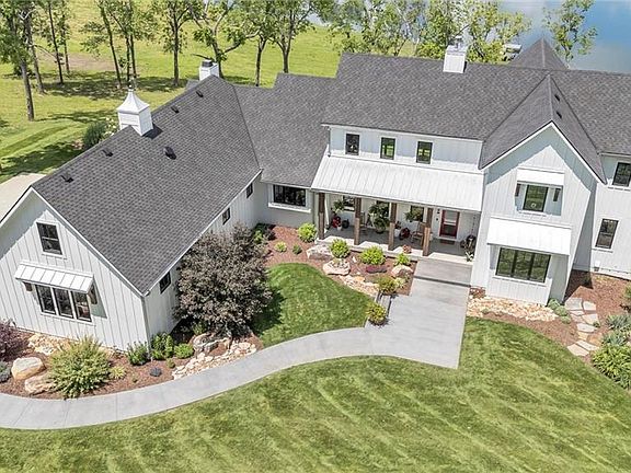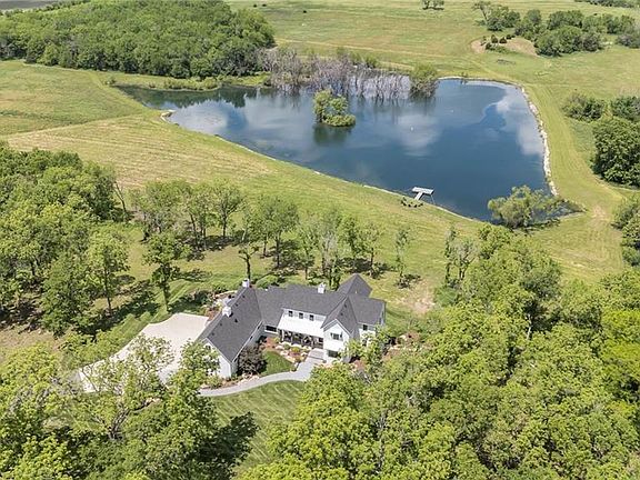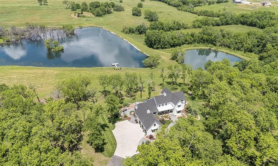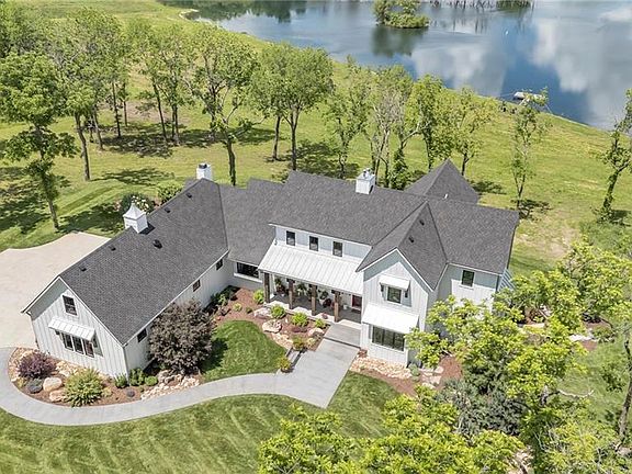 Fabulous NEW 1 1/2 story Contemporary Farmhouse style with incredible interior finishes! 99+ acres w/ stocked 7 acre lake and 1/2 acre pond! Five Bedrooms / 4 1/2 baths. OPEN floor plan w/ amazing kitchen/back pantry.... opens up to Great Room w/ beamed Cathedral Ceiling & Dining Room. Impressive stone fireplace in Great Room. White Oak wood floors throughout the main level, stairs and hallway on 2nd floor + Bonus Room above garage. 9'x 4' kitchen Island and Dacor Appliances. Main level includes office/study, Grand Primary Suite & Laundry Room. Double walk in closets. The Sun Room off the kitchen has incredible water views, stone fireplace and built in Grill & beverage frig. Covered Deck w/ sliders allow amazing views and peaceful setting. 2nd floor has 3 bedrooms & 2 baths. Prepare for FUN when you enter the lower level ! Wet bar, stone fireplace, game room, 5th bedroom and bath. Spacious storage w/ 2nd laundry and walk out to your backyard. There is a covered patio w/ hot tub to enjoy those beautiful views! Oversized 3 car garage w/ decorative garage doors. Bonus Room w/ wood floors above the 3 car garage. Stunning landscaping ! Sprinkler system around the house. Architectural Designer Pella windows with pull down screens. 40x60 outbuilding which has 12x30 heated finished space for an office or kennel. Newer Greenhouse on property! Road is owned by this property and the Seller had it paved when the new home was completed. Property only 30 -35 minutes away from Olathe Regional, St. Lukes South and Ottawa Advent Hospitals. Prepare to fall in LOVE !!! a