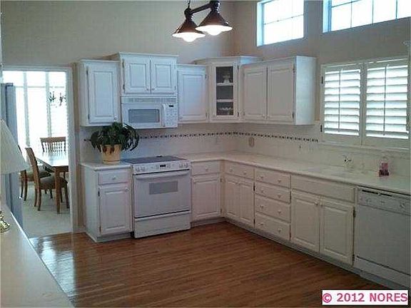 Great patio-style home in a great neighborhood. Hardwood floors in entry and kitchen. Crown molding throughout, high ceilings, lots of light, wood shutters. Master with double closets, shower, double sinks, whirlpool tub.