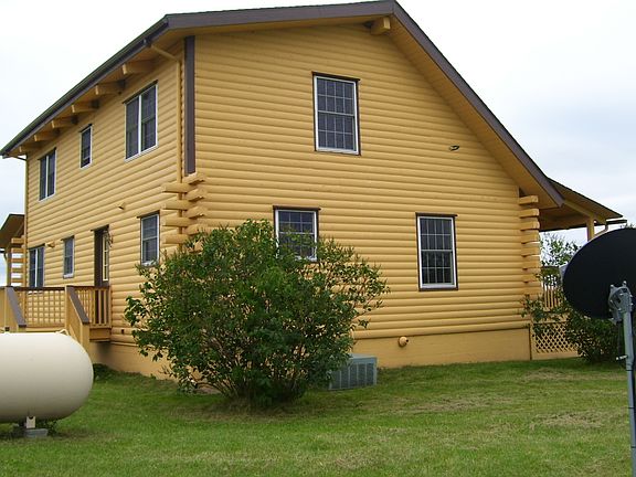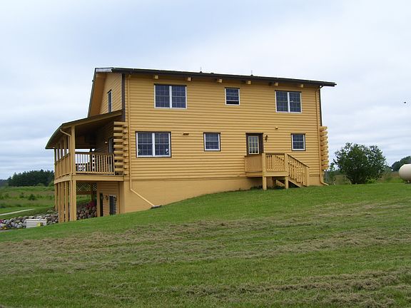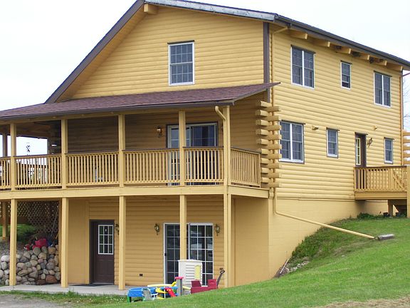 FULL LOG HOME! Beautiful hilltop home on 8.90 acres. The main floor has a master bedroom with attached bathroom, laundry, and eat in kitchen that opens up to the living room, with beamed ceilings, pellet stove, and a sliding glass door that leads you to the covered porch that wraps around two sides of the home. Upper level has a very large 14x21 bedroom, and a loft area to be what ever you want it to be. There are three bathrooms in the home with one conveniently located on each level. The walkout basement is almost finished with knotty pine, and new tile flooring, which would make a great family room for all the family holidays. There is an additional room in the basement that could be used as a third bedroom. Knotty pine and wood interiors and hardwood floors throughout.