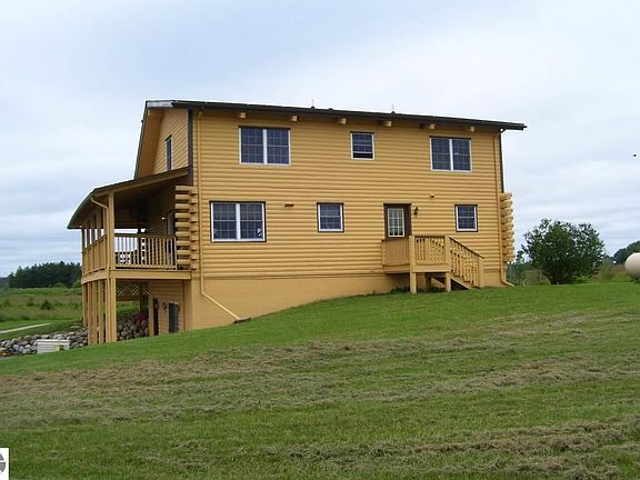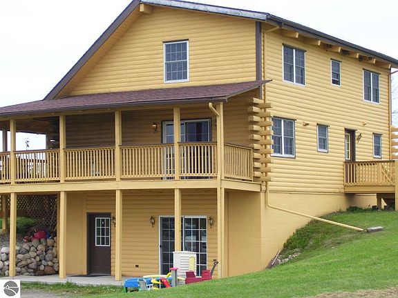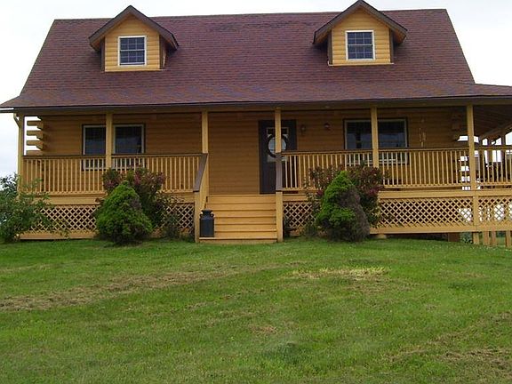 FULL LOG HOME! Beautiful hilltop home on 8.90 acres. The main floor has a master bedroom with attached bathroom, laundry, and eat in kitchen that opens up to the living room, with beamed ceilings, pellet stove, and a sliding glass door that leads you to the covered porch that wraps around two sides of the home. Upper level has a very large 14x21 bedroom, and a loft area to be what ever you want it to be. There are three bathrooms in the home with one conveniently located on each level. The walkout basement is almost finished with knotty pine, and new tile flooring, which would make a great family room for all the family holidays. Knotty pine and wood interiors and hardwood floors throughout.