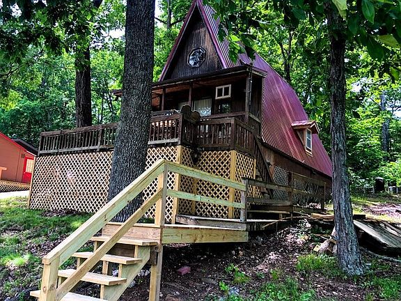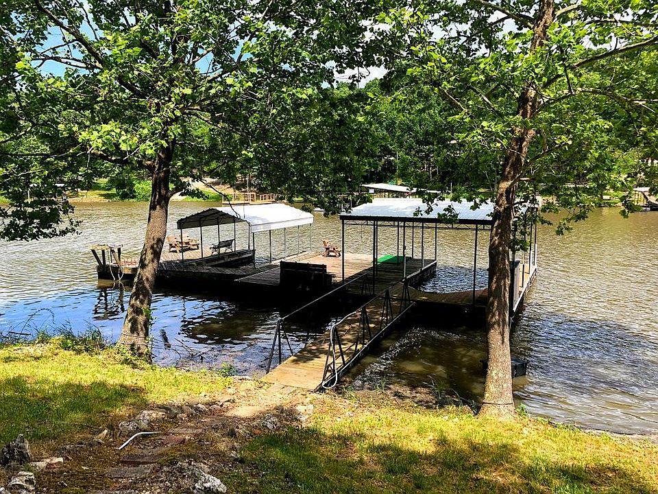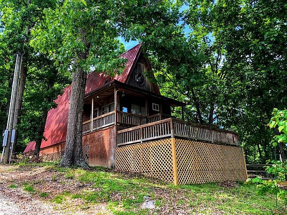 Cozy A Frame cabin with 102' waterfront, & 2 covered docks in quiet cove at the 77 mm of the Lake of the Ozarks. Brand new metal roof on this home and plenty of places for family and friends to sleep! 3 bedrooms, 1 bath, eat in kitchen, living room, and loft. Multi level deck for outdoor living/entertaining. 2 Huge lots!!! Extra lots may also be purchased with this, ask agent details. Close to Restaurant and Marina. This has been a owned by the same family for 35 years and they say many great memories were made!