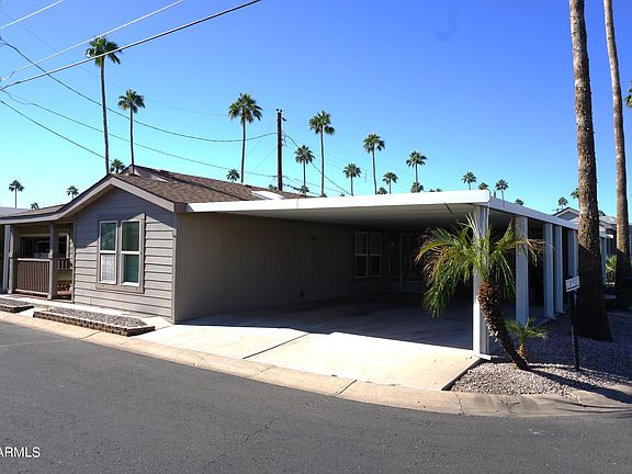 Highly sought after Palm Garden property available. One of the rare larger mobile homes that offers a double carport, Arizona room, 2 bed, 2 bath and a den. Partially furnished and will be included with the sale. Property is close to the front entrance so you can access all the surrounding features that Mesa has to offer. Roof was replaced 12/2022 and AC unit 8/2018. Priced to sell.