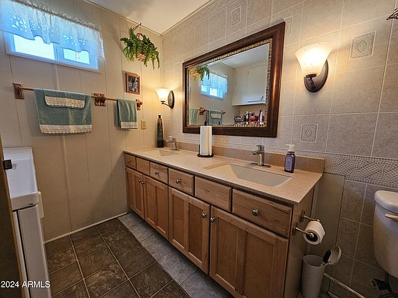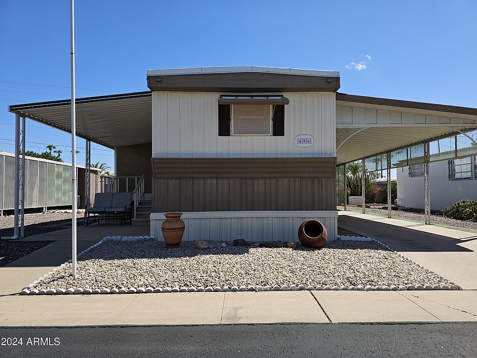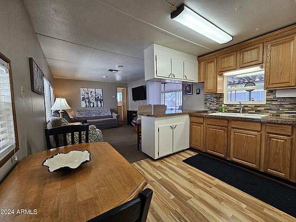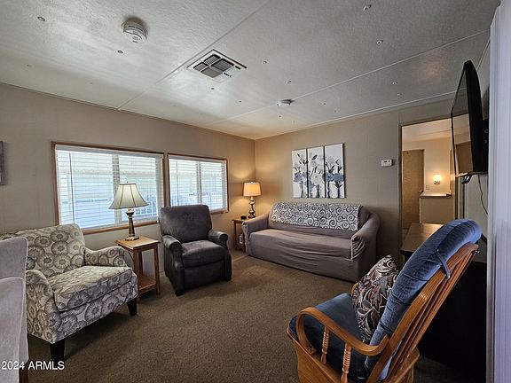Welcome to this great turn-key, fully furnished, updated mobile home. Spend your winters in sunny Arizona, or stay full time! Enjoy all the functions, amenities, and camaraderie that Palm Gardens 55+ community has to offer. This very well cared for mobile home has a split floorplan with 2 bedrooms, both with full ensuite bathrooms and walk-in closets, updated full size appliances and furniture, inside washer/dryer, and attached fully sunscreened-in AZ room, that adds an additional 184 sq ft. Outside, find room to park your golf cart and cars under the long covered car port, and a storage shed. Don't let the age detour you, come take a look at this beauty today!