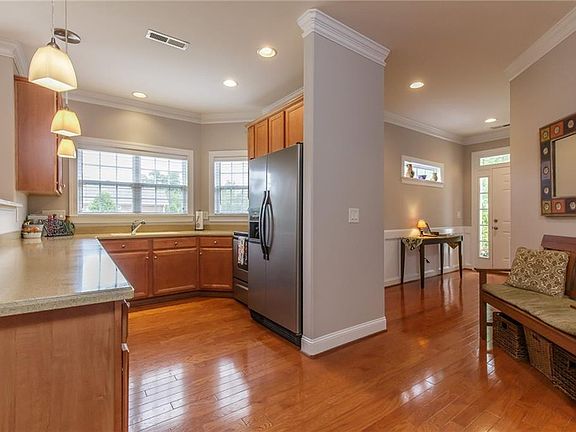 FANTASTIC 3 BR/2.5 bath on 2 levels. END unit TOWNHOME in low-maintenance Woods at Grove Park boasting 2130 sf. Custom features include 9' ceilings, bullnose corners, heavy moldings & gorgeous HWs. Entry w wainscoting leads to kitchen & expansive counter tops for food prep. SS appliances, pendant lights & high bar seating. Dining measures 12.4' x 10.10' w chair rail. Family w arched doorways, double sided gas log FP, & built-in media cubbies. Sunroom full of Ws bringing loads of nat'l light & access to patio. MBR level 1 w WI closet, luxury bathrm offering tile, double vanity, WI shower & garden tub. 1/2 bath/laundry on level 1. Level 2 w BR2: large loft w windows, dbl closet & attic storage. BR3 w skylight, dbl closet & carpet. Patio w privacy fence creating perfect to share meals, morning coffee & star gazing. END unit w grassy area. Community amenities include clubhouse, pool & social activities. Close to interstate, shopping and restaurants. MOVE-IN-READY!