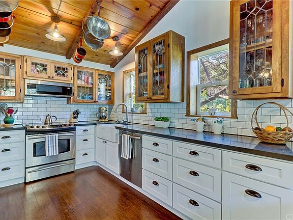 A garden paradise, this place enjoys the charm of a canyon cabin with the modern conveniences of an updated home. Living room enjoys a vaulted, open beamed ceiling, hardwood flooring, separate dining area, ceiling fan & cozy river rock fireplace. Custom entry door w/stained glass accents. Large family room features a potbelly stove, tile flooring, skylight & huge windows overlooking the grounds. Remodeled kitchen enjoys quartz counters w/ tile backsplash, cork flooring, built-in bench seating, updated cabinetry & dual-pane windows. Stainless appliances: elec.range, microwave and dishwasher. Master has a vaulted, open beamed ceiling, wood flooring, skylight, stained glass windows, walk-in closets & large view windows overlooking the grounds. Gorgeous bathroom has wood paneled ceiling & walls, river rock flooring accents, vanity w/ concrete counter & dual sinks, designer tub with tile surround, automatic skylight, built-in shelving and recessed lighting.Central heat/air, tankless water heaters,copper plumbing, reverse osmosis system. Multiple composite decks featuring a large spa w/mountain view & outdoor shower. 1-car garage w/attached multi-purpose room & 3 parking spots in the front. Fenced yard w/paths to multiple sitting areas and artificial turf lawn. Sunny gardening area w/raised planter beds, composting bin, chicken coop. Multiple fruit trees:tangerine, plum, pomegranate, avocado, nectarine, almond, white and black mulberry. Near National Forest w/miles of trails.