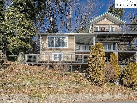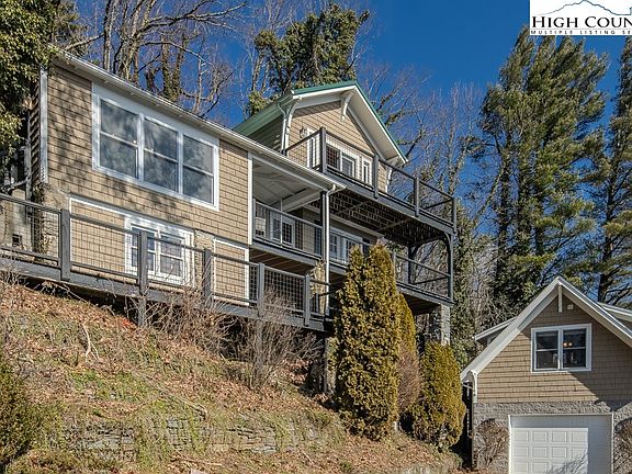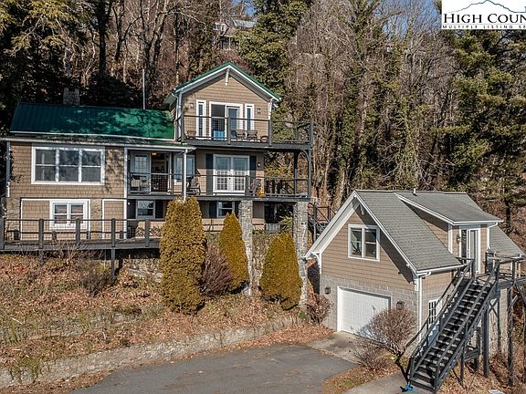 If it's all about the view, this house is for you! Enormous, panoramic views of the cascading Blue Ridge Mountains, from this majestic mountain home! Once a depot stop along the historic Lonesome Pine trail in the late 1800s. Enjoy the convenience of in-town living, plus privacy, with an end of the street location. Beautiful hardwood floors, lovely stone fireplace, clear chestnut wainscoting and original built in bookshelves in the living room. Master bedroom on the main level or with a view on the second floor, you choose! Enjoy the tremendous views over the John's River Gorge from either the sunny, open deck or covered deck below. Not included in the total square footage is a 471 square foot guest suite which features a bedroom, and full bathroom, with tile flooring above the detached, one car garage. Use garage loft as an income producing long term rental and/or extra room for guests or a private office. Buried power lines for unobstructed view. New metal roof in 2017. Coated rigid wire railing and fresh exterior paint in 2018.