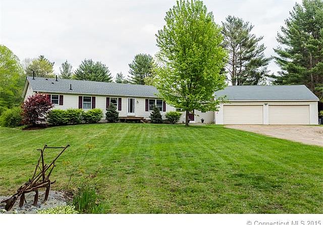 Looking for a private, peaceful country setting? How about a 4 car garage too? And 2.16 acres of solitude? Then look no more, this 7 room ranch awaits you! The home features an updated kitchen with center island, plenty of cabinets, new light fixtures & a generous space for kitchen table, completely open to living room with wood beam ceiling, wood burning stove and carpet. There is an awesome bonus room that leads from kitchen to mud room, featuring lots of windows for natural light, tile plank flooring, & doors leading to back yard. The mud room attaches to the awesome 4 car garage, which offers so many possibilities! There's a master bedroom w/full bathroom/laundry room, plus 2 more bedrooms & another gorgeous fully updated full bathroom w/subway tile, floor tile sandstone sink. All bedrooms are carpeted. Basement is huge and is partially finished, currently being used as an office, but can renovate the remaining space for a huge finished area. Multiple options to heat this home - ductless heat, wood burning stove, electric baseboard and outdoor wood furnace. The house sits on 2.16 acres in a very private, quiet part of town, very level and just enough cleared for entertaining, but lots of treed area for privacy. There are solar panels that offer lots of $$$ saved in electricity too! The AWESOME NEWS is that this foundation has been inspected and "this home's foundation does not exhibit visible signs of the effects associated with pyrrhotite-bearing aggregate".