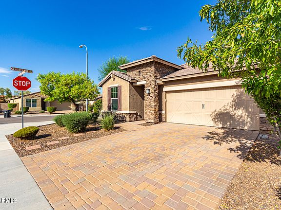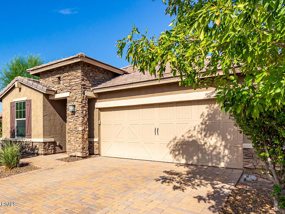 Priced below comps! Single level home on corner lot with 3 bedrooms plus Den/Office & Flex space. Great curb appeal with paver driveway & stacked stone exterior. Inside the home has 9ft ceilings, double door den/office in front of home. Open to a light & bright kitchen with Espresso Brown Cabinetry, Granite counters, Stainless steel appliances and island with double sink. Open concept living has a dining area & living room with ceiling fan, tv mount, opens to the back patio with tall glass sliders to the covered area. Flex space is an open area between 2 guest bedrooms and shared bath w/ double sinks, tub/shower combo and linen closet. Split floorplan has main bedroom set apart from the other bedrooms, king size room, separate tub shower, toilet closet, walk in closet & linen closet. This home has enclosed back yard with dog door leading to dog run with additional block wall and tall gate door. The covered patio has surround sound prewired for speakers and ready for you to entertain. All TV mounts stay! Outlets are installed above the front eves for all of the extra holiday lighting you can dream up. This is the largest single level floor plan in the community and ready for its new owners!