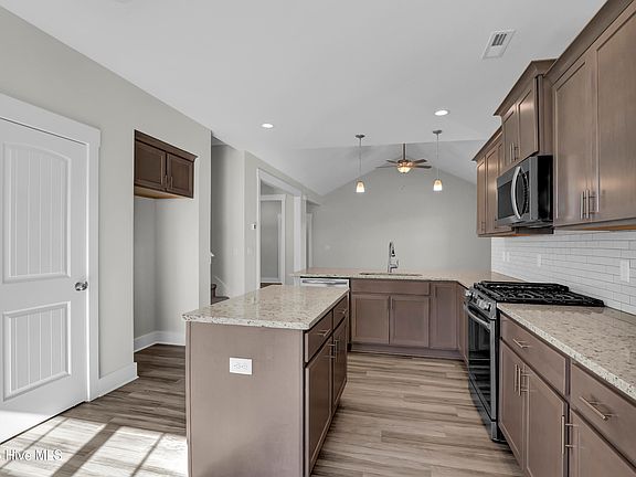 At the heart of the home is a sleek, modern kitchen with an island that serves as the focal point for family gatherings and culinary adventures. It's flanked by a cozy dining area, ideal for intimate meals and family dinners. The kitchen also boasts a spacious walk-in pantry for additional storage.