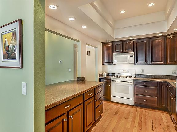 End unit. Single level townhome in Lakewood on the water. Beautifully appointed. Sweet courtyard welcomes you home! New tiled master bath w/tiled walk-in shower. Double closets. Hardwood and tile flooring throughout. Newer kitchen, floor to ceiling fireplace. Vaulted ceilings. 2nd bath has tiled shower, floor and bead board surround. Backs to one of Lakewoods beautiful water features. Private patio. Total cream puff! A must see!