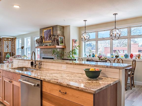 Spacious near new (2018) luxury home in coveted central Boulder. 1 mile to Pearl Street Mall; 1.8 Miles to Wonderland Lake, 1 block to Ideal, or North Boulder Rec., 8-minute walk to Old North Boulder Park. Dedicated garage parking; single story end unit. Two bedrooms, 2.5 baths, gourmet kitchen w island bar, 2 private decks plus large covered entry porch. 20 windows and 3 glass doors make this home light and airy; end-unit privacy. Views to Mt. Sanitas. W/D, Dishwasher, Microwave, gas range, SS fridge/appliances, granite throughout, Italian porcelain wood-look floors, gas fireplace, Motawi custom tilework, track lighting, central heating and A/C, noise-control double pane windows with screens, elevator access from parking garage space. Transit stop in front of building (Eco-Pass eligible). Amenities on site include Common House with full kitchen, TV lounge, yoga room, fireplace lounge; second fireplace gathering area; 2 guest rooms; art room, library; multiple lawn and garden areas; adjacent transit (EcoPass eligible) and small City Park. Outdoor community gas grill. Communal decks and covered patio. Owner pays gas, water, trash, recycle, compost.