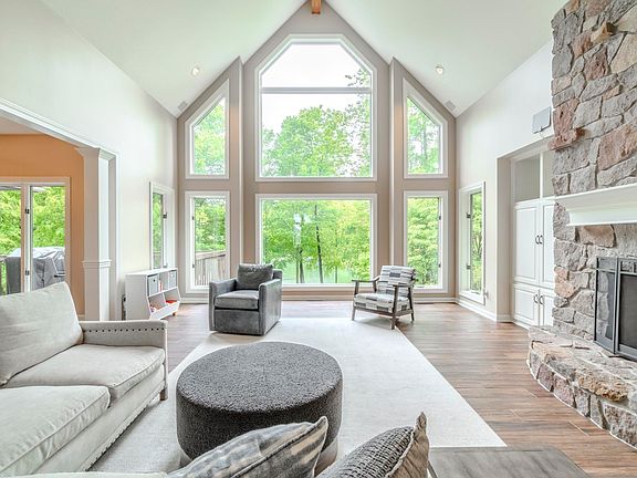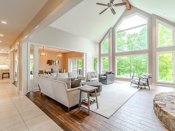 Renowned builder, Roy McNett, built this architectural masterpiece on a stunning lakefront lot. Step inside to experience the breathtaking views of the backyard captured by a full wall of windows in the living room, kitchen, and owner’s suite. Enjoy a time of renewal in the spacious screened porch or a quiet moment in the beautiful den. Cooking is easy in the remodeled kitchen boasting a walk-in pantry, granite counters/island, backsplash, double oven, gas cooktop. The luxurious owner’s suite comes complete with a vaulted bedroom, huge walk-in closet, tiled shower, jet tub, separate vanities, and a private living room with access to the lush backyard. Multiple rooms for entertaining in the LL include the intimate bar in the cove, massive family room with second FP, 4th bedroom, full bath, additional storage, and 4th garage with door access for riding mower. Extensive upgrades within the last few years: roof and deck, 2 furnace/ac units, tankless water heater, various windows. An oversized 3-car garage, walk-in attic access, attic fan, refreshed landscaping, and an amazing view of the lake make this home one-of-a kind. Three photos of the lower level have been staged with furniture but accurately reflect the structure.