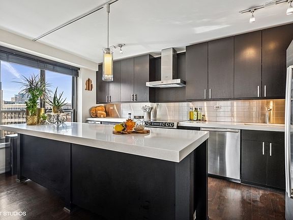Welcome to EAST LAKEVIEW and living on the lake! This SOUTHEAST CORNER 2 bedroom, 2 bathroom condo is in a FULL AMENITY, ELEVATOR building. The unit is SUN DRENCHED with nice CITY VIEWS and a PEEK of the LAKE through the large windows. Gorgeous hardwood floors in the common living space and an MASSIVE KITCHEN ISLAND with room for 6 stools plus plenty of room for a dining table. The kitchen is outfitted with QUARTZ, a stainless backsplash and stainless appliances. WASHER/DRYER in-unit and CUSTOM, ORGANIZED CLOSETS throughout. The primary bedroom easily fits a KING BED and has an EN-SUITE BATHROOM. The 2nd bedroom is generous to fit a bedroom ensemble (currently has a pull-out couch for a queen bed & large wall storage units). The unit has blinds throughout and modern tile finishes and lighting in the bathrooms. The building includes evening doorstaff, extra storage, bike storage, exercise room, roof/sun deck (with grills), package receiving, additional laundry services and GoGrocer in the building. BUS (151) access right out your door! GARAGE VALET PARKING available to rent.