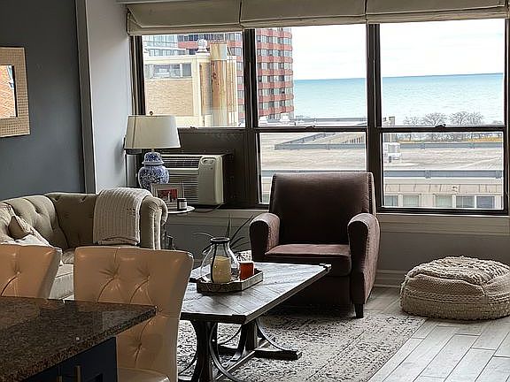 Amazing one bedroom unit with lake views in perfect location steps to the park, lake, diversey driving range, running paths and fantastic Broadway strip. The current owners spared no expense transforming the unit into a more contemporary feel with wood grain tile plank flooring, primed/painted the kitchen cabinets and island, added new backsplash, new brass kitchen cabinet pulls, new kitchen/bath faucets, new paint and new carpet in the bedroom. The open concept floor plan has a very generous sized living space with large eat-in island perfect for entertaining or cozy dinners at home. The well appointed bathroom has stone tile throughout and is perfectly situated directly across from the spacious bedroom with excellent closet space. Completing this impeccable unit is a large entry closet and an additional pantry space with in-unit washer and dryer. All this and in a very well run association with great amenities that include an exercise room, party room, rooftop deck with common grills, extra storage and an attached boutique grocery store. A truly spectacular unit in an excellent Ease Lakeview location. Attached indoor parking in the bldg available for rent or purchase.
