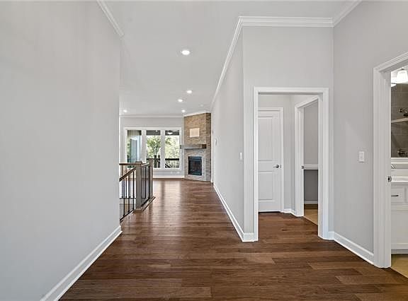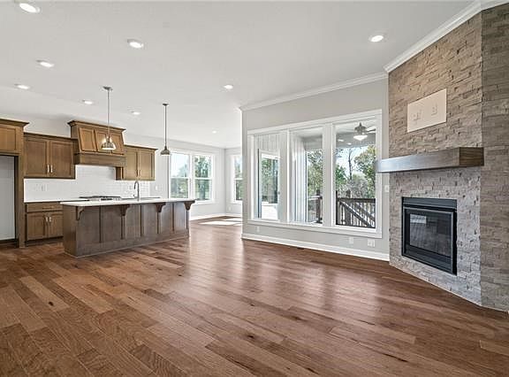 PHOTOS ARE OF PREVIOUS MODEL** Looking for main level living with lawn/snow maintenance, irrigation winterization/startup included, sunset views, AND privacy behind? Here it is! The Somerset reverse 1.5 story. This expansive plan features the primary suite, 2nd bedroom/bath, and laundry on main. The beautiful white kitchen appointed with stainless appliances and large walk-in pantry is positioned for easy entertaining and will keep you connected with family and guests at the island or in the dining and great rooms. Wood floors extend through throughout the main level and complement a stone fireplace that, with floor to ceiling windows, brings the outdoor feel inside. The lower level joins two more bedrooms (with walk-in closets), a beautifully tiled 3rd full bath, loads of storage, and very large rec room with more floor-to-ceiling windows that look out to the patio and yard with green space behind. The covered low-maintenance composite deck provides endless hours of private sunset views. A full radon system and perimeter alarm system are included too for your peace of mind. $120/mo maintenance dues provide complete lawn care, driveway snow removal up to the front porch, and annual winterization and startup (and backflow testing) of the included zoned irrigation system. Annual dues also apply. Amenities include a huge pool with reef & kiddie areas, a big screen and stereo equipped clubhouse with covered lanai and built-in gas grill, a playground and basketball