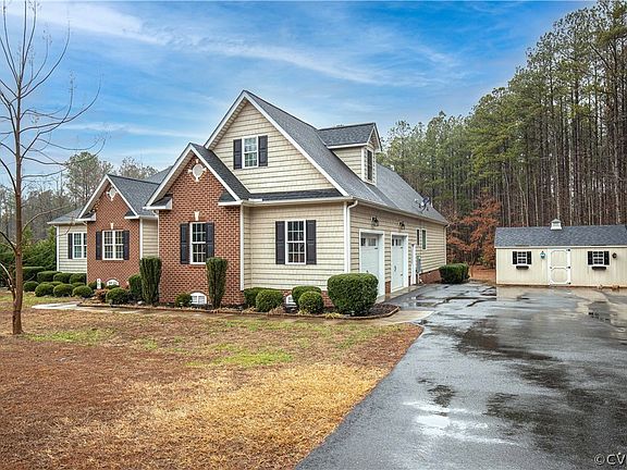 Located in Waterford Landing-a waterfront subdivision on Lake Chesdin in Dinwiddie County. Custom built home in 2014 on a well manicured 2.51 acre lot. The lovely home has hardwood floors and crown moldings. Custom kitchen with breakfast bar with pendant light, ceramic tile backsplash, beautiful granite counters, island, pantry and upgraded stainless steel appliances which all together provide a space that is both functional and inviting. You will enjoy the large great room and cozy gas-log fireplace. Primary suite has the luxury of the spa-like en suite bath. The spacious home has plenty of storage walk in attic, finished bonus room, finished oversized garage, detached shed and space under deck. This custom built Home is Awaiting to be your Forever Home!!!