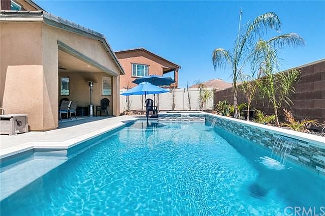 A peaceful backyard retreat, you will have when you enjoy this sanctuary which showcases your newly installed heated pool and hot tub. Backing up to the reserve, with no one behind your property, you feel the privacy and calm. This home is tastefully decorated and will catch your eye as you enter the front door and notice the vaulted ceiling, stunning stairway, wainscoting and the five inch baseboards. The downstairs has a full bedroom to the front of the home and a full bathroom. Neutral luxury vinyl flooring is throughout the downstairs with the exception of this front bedroom which features carpet. As you continue, to your left is the formal dining, which is being used as a good size gym area and opens into the main family/living room. One centerpiece of the home is an upgraded electric fireplace with travertine stone. This area also opens to the kitchen with an oversized island and has cabinets for days. You also have a walk in pantry, upgraded travertine backsplash, stainless appliances and plenty of granite countertop. Across from the kitchen is another dining area that is a great entertaining space and very accessible to this large kitchen. Attached to this dining area, is a smaller office space that is just tucked away. Upstairs features carpet and at the top of the stairs is a generous loft with built in surround sound. This room has windows to the front and side of the house. Here there is access to the upgraded whole house fan. Down the hall are two guest bedrooms and a guest bath with dual sinks, quartz counters and a shower tub combo. As you come down the hall is the upstairs laundry room and the master suite away from the bedrooms. The master is large and has nice windows and an en suite master bath. There are two vanity areas, a deep soaker tub, and a large separate shower area. A walk in closet completes this space. The backyard has a brand new heated chlorine pool that is five and a half feet in the deepest part and a new spa that can seat eight comfortably along with stamped concrete decking. It has a custom automated system by Hayword. The covered California room keeps you out of the heat when you are not in your pool and is a great entertaining space to bbq. The garage has a tandem and has room for three cars. Security cameras stay with the property. This home is part of the Summerly community so you have access to the pools,parks, bbq area and the Links golf course. Not far from the minor league ballpark or the 15 freeway, and low HOA!