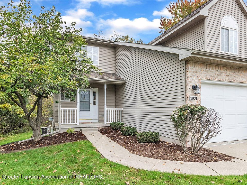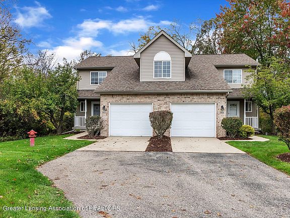 This 2-bedroom, 2 & 1/2 bath duplex condo is just minutes from Lansing, US-127, MSU and trails. Enter the condo from the private front porch into the foyer with it's attractive staircase to the 2nd level, updated kitchen and powder room. The living room with 2-story cathedral ceiling and neutral carpet is warm & inviting with a wall of windows framing the gas log fireplace. Unwind in the dining room featuring sliding doors to the deck with a backdrop view of nature. The galley kitchen is updated with white cabinets, Quartz countertops offers tons of counter space! At the top of the stairs is a view into the lower-level living area leading into the master suite with vaulted ceiling and his & her closets. Master bath is beyond the closets. A guest bedroom & main full bath complete the level. Lower-level features daylight windows, carpet and plumbed for an additional bathroom. Rear deck is tucked into the corner of the wooded area! 1-car finished garage. Taxes are non-homestead.