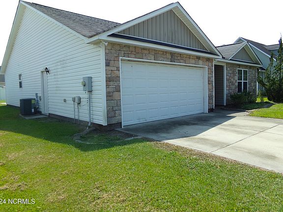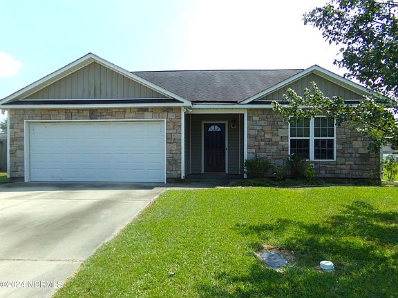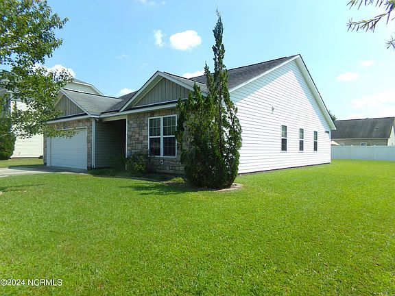Beautiful 3 Bedroom 2 Bath single home with stone exterior accents and a large back yard in the popular Brices Crossing subdivision. Please note: Lawncare provided as part of the monthly rent. This attractive and well-maintained property boasts many upgrades that will impress potential tenants and make life at this property a fun experience. The front door opens to a porcelain tile foyer with an oversized coat closet which leads to the great room with raised cathedral style ceiling and a stone fireplace with propane gas logs. The kitchen has ample counter space, lots of cupboard storage, newer appliances, and new LVP flooring. The dining room has sliders that open to a patio suitable for grilling out and entertaining. There is a separate laundry room with washer and dryer hook ups and a pantry closet. The primary bedroom suite has crown molding accents, linen closet, a huge walk-in closet, and ensuite bath with twin sinks, an oversized soaking tub, and an additional linen closet. The two additional bedrooms have ample closet space. The substantial back yard is large enough for entertaining and outdoor activities. The oversized two stall garage includes a built-in worktable and the driveway will accommodate two vehicles for off street parking. Small pets are welcomed with a monthly pet fee. Please note: The monthly rent includes lawncare, freeing the tenants to enjoy the many exciting activities on the North Carolina Crystal Coast.