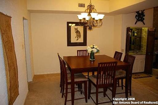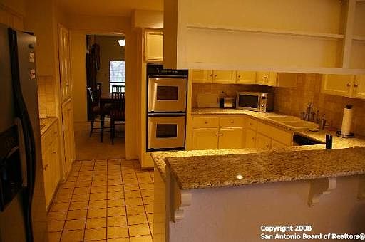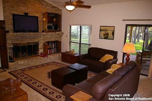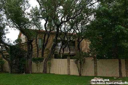 Golf course modern luxury! Granite counters in kitchen w/ all stainless steel appliances. Large living area w/ brass lined brick fireplace, built-ins & granite wet bar looks out on the oak lined 2nd green w/ covered deck. Fountain water feature in brick lined garden alongside beautiful double door entry & matching wrought iron chandelier in dining room. Wood blinds throughout. Upstairs balcony & 2 Saltillo tiled side patios overlook landscaped HOA maintained private side yard w/ many oaks & sprinkler system