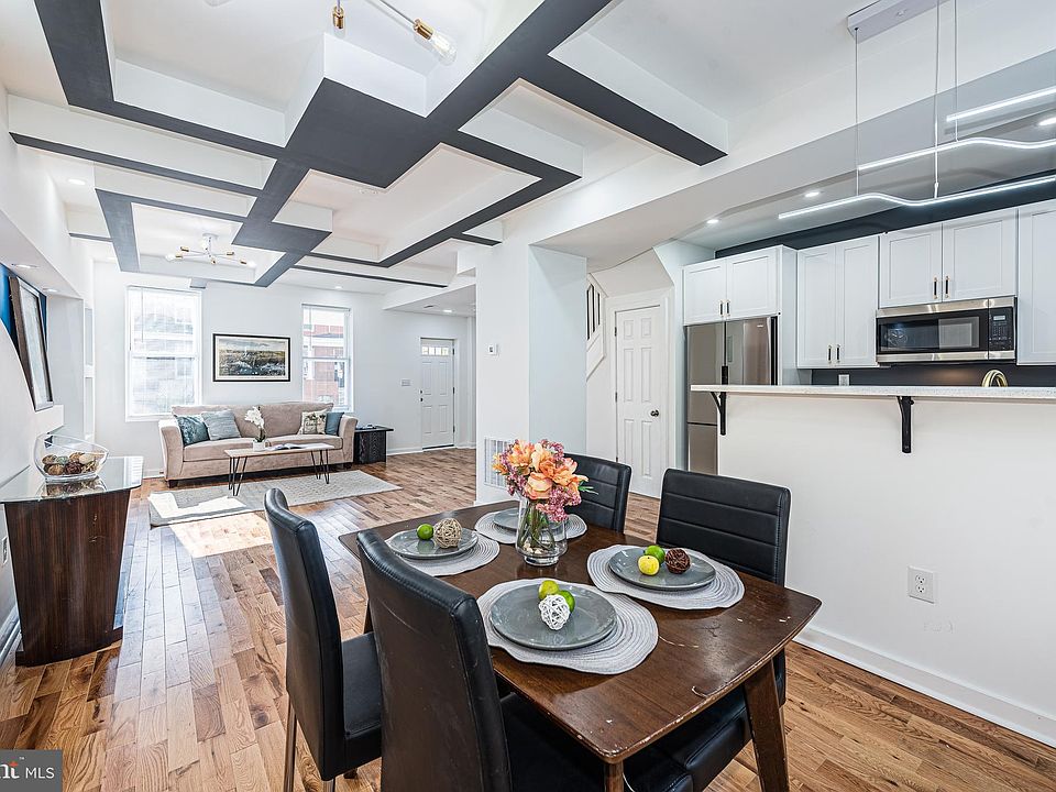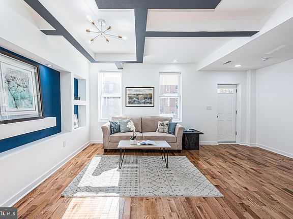 METICULOUSLY RENOVATED PORCH FRONT ROWHOME WITH 3 FINISHED LEVELS & OFF STREET PARKING! Open floor plan featuring wood floors and custom ceilings & walls with built-in shelving throughout the main level, a spacious living room, separate dining area, designer kitchen with ss appliances & Quartz counters, upper level Primary Bedroom suite with a full bath and 2 additional bedrooms with a hall bath, fully finished basement with a family room, 2 additional bedrooms, and a 3rd full bath, a rear deck for entertaining, and convenient off street parking!