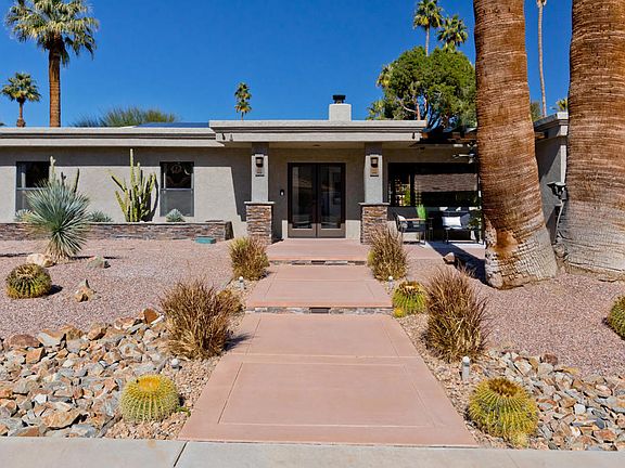 Here is your chance to own a part of Palm Springs's history with this original Alexandra construction home located on an expansive corner lot in the desirable neighborhood of Los Compadres. This 3BR/2BA, 1,992 sqft residence is surrounded by designer landscaping with intoxicating views of the San Jacinto mountains and the famous Hope residence. This thoughtfully styled flowing layout has tons of natural light, beautiful tile floors, arched doorways, a spacious living room featuring a wood fireplace with a natural gas log lighter, and a large bonus room. The kitchen features stainless steel appliances, newly refaced cabinets, a breakfast bar, a gas stove, and a built-in wine refrigerator. Entertaining possibilities abound in the backyard, which has a heated saltwater pool/spa a covered patio with ceiling fans, a fire pit, and an outdoor bar with a built-in BBQ grill and fridge, just perfect for entertaining. After a perfectly fabulous Palm Springs day, retire to the oversized primary ensuite bedroom with large closet space and patio access. Each additional bedroom is generously sized with a dedicated closet. Other considerations include PAID SOLAR! New AC, 2-car garage with built-in cabinets and split A/C/Heater and a 20' X 40' RV parking pad. This home is minutes away from all major stores, trails, Demuth Park, and PS Airport. The home is an active STR. At the time of listing Los Compadres remains below the STR neighborhood cap. Buyer to do own due diligence.