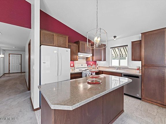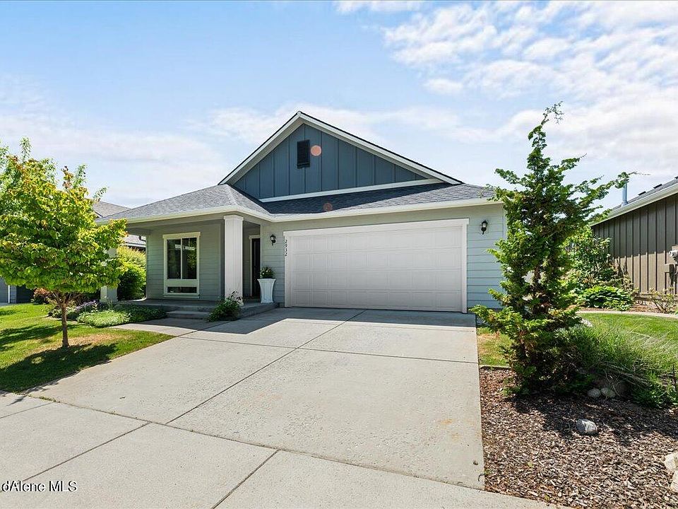 This CdA Place home offers 1,410 sq ft, 3 beds, 2 baths, central A/C, vaulted ceilings, a spacious kitchen with large island, pantry & all appliances (including washer/dryer) , split bedroom design, master suite with walk-in closet & walk-in tile shower, and finished 2-car garage. Escape to the fully fenced backyard where you will find a professional landscaping including stone walkway, garden boxes, mature trees, southern exposure, oversized covered patio with automatic sunshade awning! Enjoy all that Coeur d'Alene Place has to offer with easy distance to schools & dining & coffee shops while living across the street from green space, miles of trails and a multi-acre park!