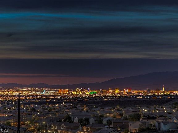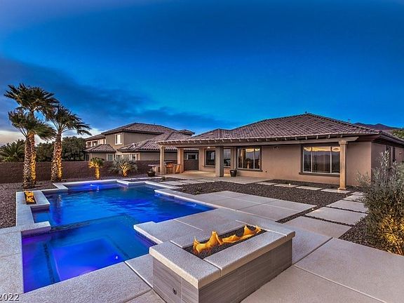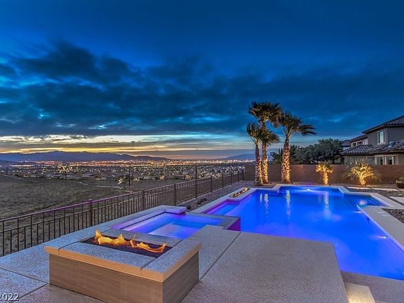Hill top lot with panoramic city and mountain views! Quiet street at the end of the community that lives like a cul-de-sac. The spacious great room is ideal for gatherings with a fireplace, large, picturesque windows of the backyard paradise and mountain sunsets. A well-appointed kitchen featuring granite countertops, tile backsplash, island with breakfast bar, walk-in pantry, breakfast nook, stainless steel appliances, including double ovens, 5-burner cooktop, and built-in microwave. The grand primary retreat is separate from other bedrooms with a walk-in closet, 2 vanities, garden tub, separate shower, and great views. Large secondary bedrooms each have walk-in closets. The backyard sits high above the canyon and is perfect for entertaining with serene panoramic views, resort style pool, spa, a firepit and a fire feature, lush low-maintenance landscaping, covered patio, built-in barbecue with refrigerator, landscape lighting, wrought iron view fencing and no neighbor behind the home.
