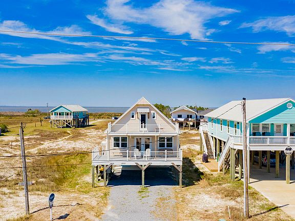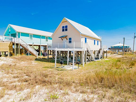 Gulf Shores best kept secret! Priceless views of the Gulf of Mexico, sunshine, and warm salt air await you at this lovingly cared-for upscale cottage-style beach home. Warm southern sunlight fills each space in the well-designed home, highlighting the true attention to detail, care, and comfort this once-in-a-lifetime home offers. Located near the very tip of the Gulf peninsula, this home exudes an island vibe, welcoming all who enter the updated interior with bright walls, beadboard ceilings, modern finishes, and scenic views from nearly every vantage point within the home. Quartz countertops, stainless appliances, and stylish cabinetry adorn the kitchen, ready to become the prep space for grilling, beach picnic baskets, or a quick lunch between surf sessions. Enjoy your meal in the adjoining living room with a fireplace or dining room, both with incredible gulf views or from the TREX decking-covered front porch with a peaceful porch swing, allowing you to watch the tide roll in as you sip your cooled beverage of choice from the wine fridge. Then, wander below the home to a secondary covered seating area with equally impressive views as you cook up your freshly caught fish on the grill or spend the evening watching the sunset. Inside the main level, the primary suite offers you total privacy, with a luxury ensuite behind a barn door with quartz counters, a walk-in closet, and a private balcony facing the bay. Additional highlights and amenities include a covered parking area, a dedicated fish cleaning station, a laundry room, two guest rooms on the second level with bay views, and a third guest room with a private balcony facing the Gulf - how luxurious! There is no time like now to invest in your future and enjoy the Gulf like never before.