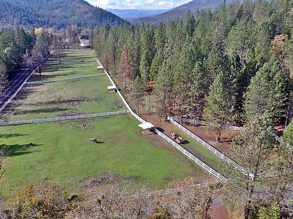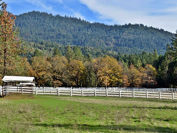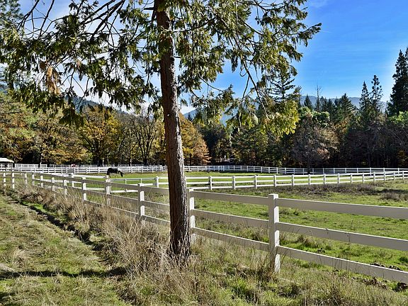 Wonderful equestrian facilities, w/ lovely 3 BR 2.5 BA home on 21 pvt acres & 2 tax lots (poss. 2nd home). Main barn has 5 dbl depth stalls, insulated tack room, shop space, feed & supply rooms & large,2nd flr bonus room/office. Cvd. 60x120 arena w/ full length shed row - 9 stalls & 2nd tack room; round pen, wash rack, equip storage and pastures w/ turnouts & irrig. Gated, fenced & x-fenced. Minutes of Grants Pass. Amenities Package