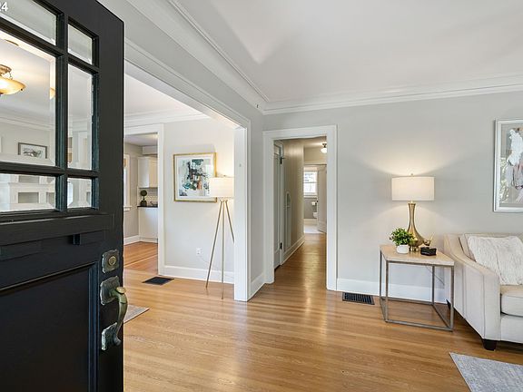 Amazing 1926 Bungalow that combines vintage charm with modern functionality. Open floor plan and large newer windows with hardwoods throughout make this home light and bright. From the covered front porch overlooking the quiet street, step into the inviting living room with it's coved ceilings and gas fireplace framed by built-ins. Built-ins and coved ceilings also adorn the dining room and lead you into the updated kitchen with new induction stove. Use one of the two bedrooms on the main floor as a den or home office. The primary bedroom upstairs is like it's own sanctuary with its roomy bathroom and large walk-in shower. Retainer wall in the front and mature vegetation offer privacy from the street. Enjoy a quiet evening on the backyard patio looking out at the easy care yard which is neat as a pin. The 2 car garage is clean with new garage door and vinyl window -plenty of room for your cars or workshop area. In addition to it's charm this home has a new roof, outdoor lighting, radon mitigation system, seismic strapping, tankless water heater, and vinyl windows with an energy score of 7! Primo location with easy access to shopping, restaurants, airport, public transportation. Walk score is 82 and bike score is 98! Offer deadline is 5pm Wednesday. [Home Energy Score = 7. HES Report at https://rpt.greenbuildingregistry.com/hes/OR10229677]