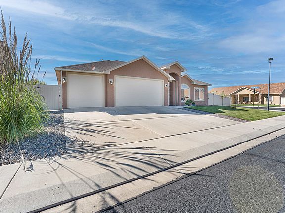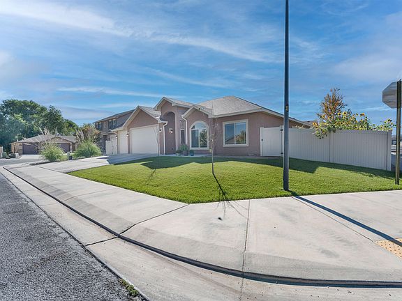Updated home on a large corner lot in Riverview Estates; a coveted community overlooking bluff site on Orchard Mesa! This fabulous property features an open floor plan that's conducive for home entertaining as well as functional every day living! Living room offers plenty of room and feels extra spacious with vaulted ceilings and plenty of natural lighting showing through large picture windows! High-end kitchen remodel offers premium cabinetry, granite counter tops, large center island, tile backsplash, coffee bar area and stainless appliances, including gas range! Separate formal dining area is the perfect gathering space for family functions! 4 generously sized bedrooms, each with their own spacious closet space. Primary bedroom offers en-suite bathroom with granite-clad dual vanity, walk-in shower and relaxing jetted tub! Additional bathroom also boasts dual vanity and large tub/shower combo! Privacy fenced backyard is the perfect for outdoor relaxing on the large open deck with outdoor appeal in the built-in planters, shade sails and charismatic string lighting! Enjoy incredible Grand Valley views, convenient access to Downtown and area shopping, entertainment and restaurants, and energy savings received from the LEASED SOLAR PACKAGE! This MOVE-IN ready home is truly a MUST SEE!