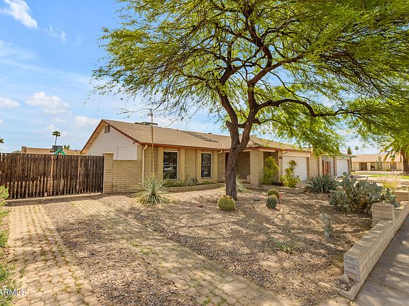 Welcome to your desert oasis in Arizona! This charming energy efficient home boasts stunning desert landscaping adorned with majestic cacti. Freshly painted interiors greet you as you step inside this spacious 3-bedroom, 2-bathroom home. Entertain guests in the living/dining room or cozy up in the family room by the fireplace. The eat-in kitchen features granite countertops, perfect for culinary enthusiasts. Retreat to the generous master bedroom, complete with a sunken tub and shower, a serene sitting area, and French doors leading to the patio—ideal for relaxation or conversion into a den.