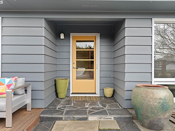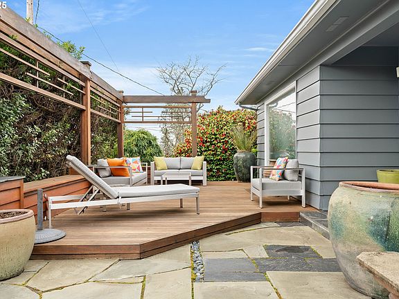 This extremely well maintained mid-century gem overflows with charm, color and quality! The home has a totally remodeled, modern kitchen with stainless steel appliances as well as two remodeled, full bathrooms. There are original hardwood oak floors throughput all of the main level. The dining room has a beautiful, custom made concrete dining room table. You will find a cozy wood burning fireplace in the formal living room, with French doors leading to a tranquil back yard. There you will discover a covered, slate floored patio, hardwood deck and two fully functional water features – currently winterized. At the front of the home, there is a beautiful, hardwood deck where you can sit and enjoy the sunset while sipping on something nice... Downstairs, there is a full bathroom and the flex room/family room provides numerous possible configurations. The optional 3rd 'bedroom' is non-conforming, only due to its window size.Absolutely gorgeous, low maintenance landscaping. It has a great location in the Hillsdale neighborhood - close to notable restaurants, parks and OHSU!Old growth Cedar siding, updated electrical panel and a newer, ultra-high 97% efficiency gas furnace.