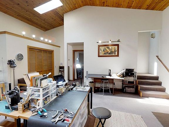 This custom 2BR/3BA home has a detached 5 car garage, 24 x 30 studio/shop space and a 817 SF sauna/spa building with bathroom. Perfect for an artists retreat,vacation rental or primary residence! Nestled back in the trees and offering some privacy with the convenience of in town living. Spacious living areas, quiet setting and the bonus of extra storage in the garages and shop.