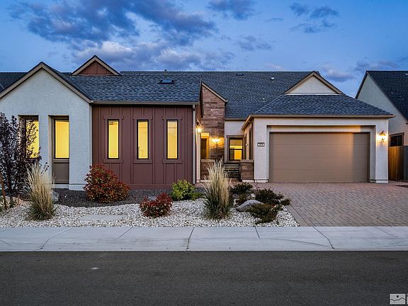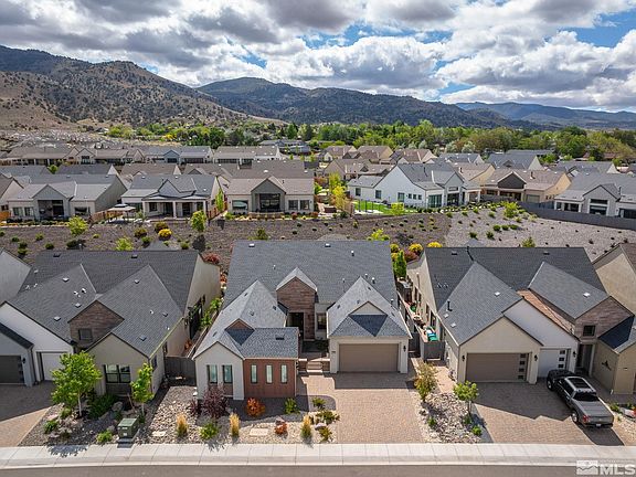 Wonderful location behind the gates of Ridgeline at Carmella Ranch. Walking distance to schools, close proximity to shopping, restaurants, recreation trails, and a short drive to Mt Rose Ski Resort and Lake Tahoe! Welcoming great room features 14' ceilings and floor to ceiling stone fireplace. Beautiful upgraded hardwood flooring flow throughout the living spaces. Fantastic kitchen with large island, quartz counters, and upgraded extra tall cabinets open to the spacious living area and the large office/den., The private primary bedroom has dual vanities, huge walk-in shower, and large closet. This wonderful floorplan has 2 big secondary bedrooms with a jack-and-jill bath, a spacious laundry with utility sink, and a separate third car garage bay! Enjoy high quality finishes throughout including beautiful flooring, modern fans, custom stylish Hunter Douglas blinds, and Epoxy garage floors. Ridgeline at Carmella Ranch features resort style amenities including pool, gym, and more. A must see, move in ready home!