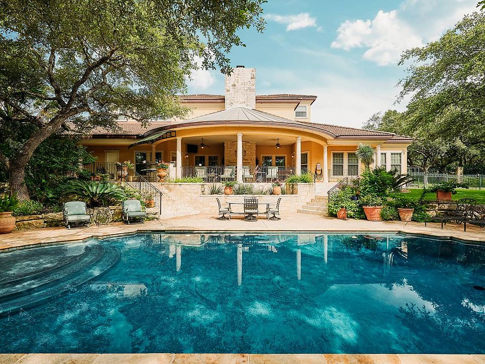 Spread across approximately 1.16 acres carpeted with heritage oak trees and meticulous landscaping, this elegant home affords a prestigious Hill Country lifestyle. Unforgettable soirées are sure to be enjoyed amid the formal living and dining rooms, prepared within the premier island kitchen and discussed later in the sunny breakfast room. Plentiful amenities include the attached home gym, home office and well-appointed guest quarters with kitchen and sitting area. Abundant storage, high-end surround sound and whole-home security system contribute additional convenience to this estate. Outside, relax within the refreshing resort-style pool with spa or enjoy the covered terrace outfitted with an outdoor kitchen, bar and fireplace. With a home like this, you'll never need to leave.