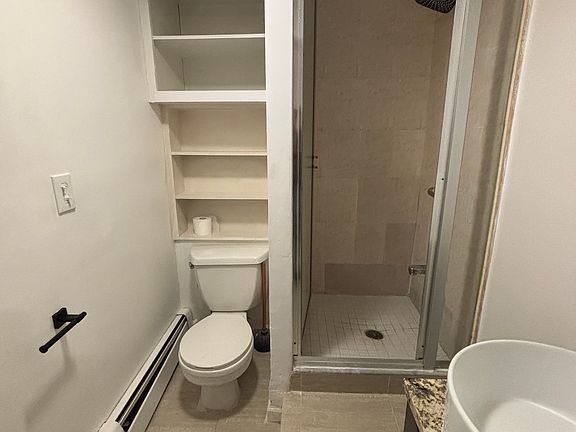 This well maintained ground floor apartment offers a functional layout with modern finishes, making it a great choice for renters seeking comfort and convenience. Living Area: Open-concept space with tiled flooring, recessed lighting, and a neutral color scheme, allowing for flexible furniture arrangements. Kitchen: Equipped with ample cabinet space, a gas stove, a vent hood, and a retro-style countertop for a unique touch. Bathroom: Features a step-in shower, built-in shelving for storage, and an updated vanity with a modern vessel sink. Flooring: Sleek, easy-to-maintain tile flooring throughout the unit. Storage & Utilities: Includes built-in shelving and baseboard heating for comfort