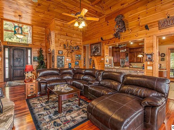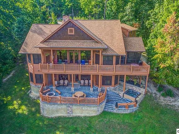 Private gated entry, fantastic level large parking area as you enter this upscale Mountain home on 2.5 acres. It has magnificent pristine views of majestic layers of the highest mountain peaks. Walls of glass, all custom wood interior, beautiful gleaming hardwoods. Located in the most desirable of all resorts, a 5 minute drive from all the action in the Summit at Bluff Mountain. Four spacious bedrooms along with a bonus room all with their own private baths. And an office that is currently being used as an extra guest room on the main level. Five total baths. Oversized generous decks and porches make this an indoor/outdoor fantastic getaway or private residence. Also perfect as an investment property has the potential for over $120,000 a year in gross income- at this time it is a second home. You will love the three mountain stone gas fireplaces, custom handcrafted touches and materials, granite, the open upscale kitchen, the large recreation room, the huge bunk bonus room, vaulted high ceilings with large gorgeous timbers, Separate laundry and pantry off the kitchen. Vaulted screened in porch anchored by a handsome fireplace. Stone Fire-pit and hot tub off the recreation room - nothing is left out! Tastefully decorated in a rustic Smoky Mountain décor comes fully furnished. Oversized two car garage. Mature landscaping makes this property a rare find! You will not be disappointed in the quality and the maintenance.