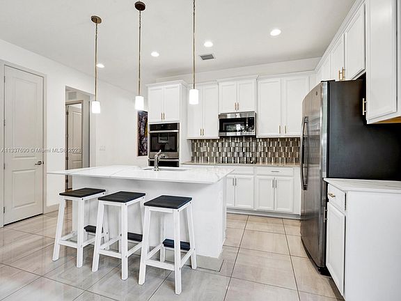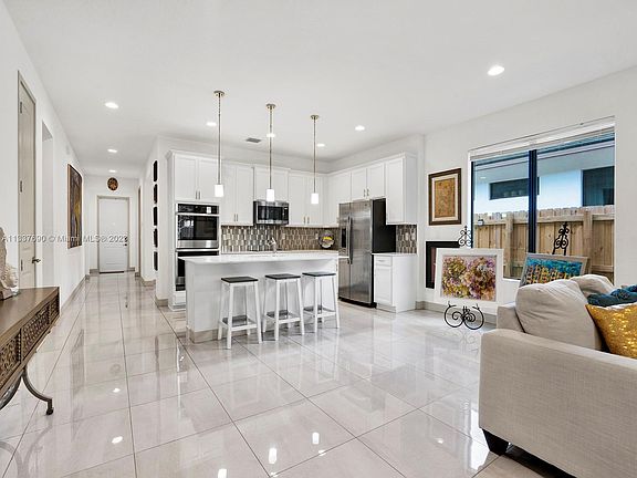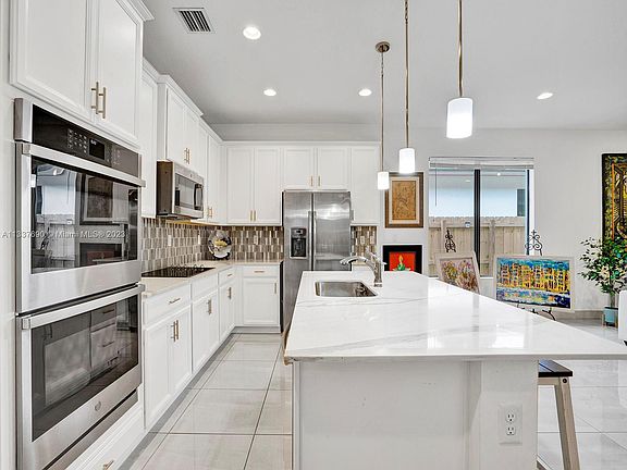 Amazing opportunity to own in the highly sought after prestigious One Palm community! This stunning three bedroom, two bathroom home finished with porcelain tile throughout features a den, formal dining room, huge great room, tons of closet space, beautiful impact windows and a two-car garage! The home also features grand high ceilings, an open concept gourmet kitchen with stainless steel appliances, built-in double ovens with a flat cooktop and beautiful white cabinets to match its white quartz countertops. Parking is a breeze with one of the LONGEST driveways in the community. Relax on the expansive covered lanai in a backyard that is perfect for entertaining. Your home is minutes from the Turnpike, Publix, and all of your restaurant shopping needs and best of all, there is no CDD!