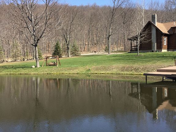 A little piece of Heaven. This is Country Living at it's best. See yourself sitting in hot tub on porch overlooking 1/2 acre stocked pond complete with dock,diving board and slide. Tongue & Groove Pine Log home has 3/4 bedrooms and 2 full baths.Open floor plan. Possible first floor bedroom with First floor full bath. Laundry on first floor. Whirlpool tub in second floor bath. Property has 2 car garage,a carport, workshop and second floor storage. Dog kennel. Paved driveway. Privacy and tranquility on this 5.6 acre lot. . PRICED TO SELL.